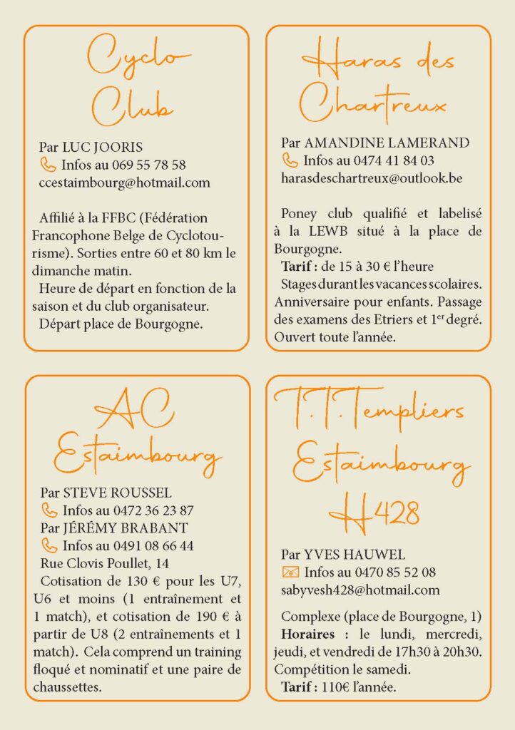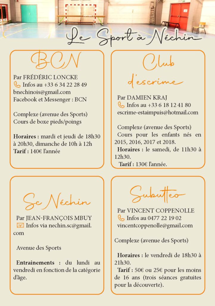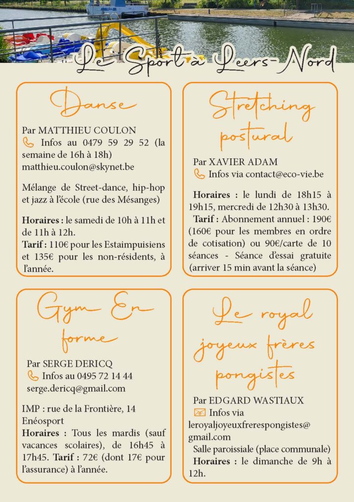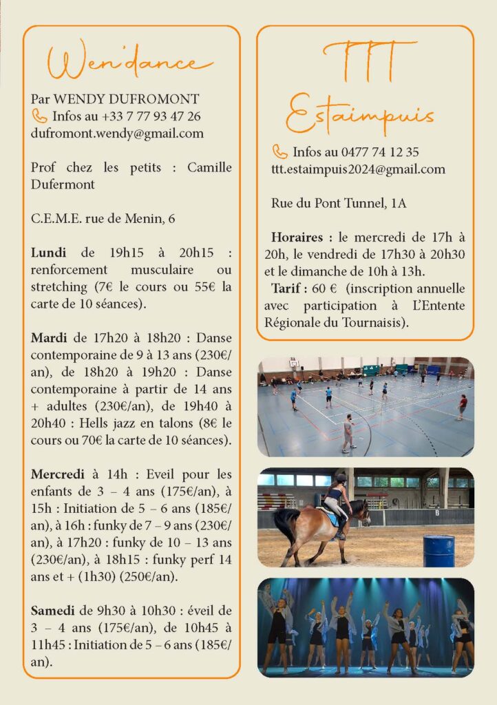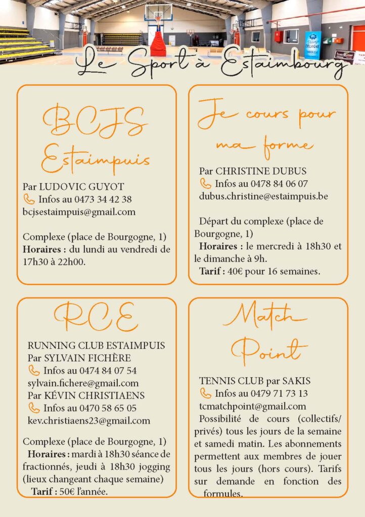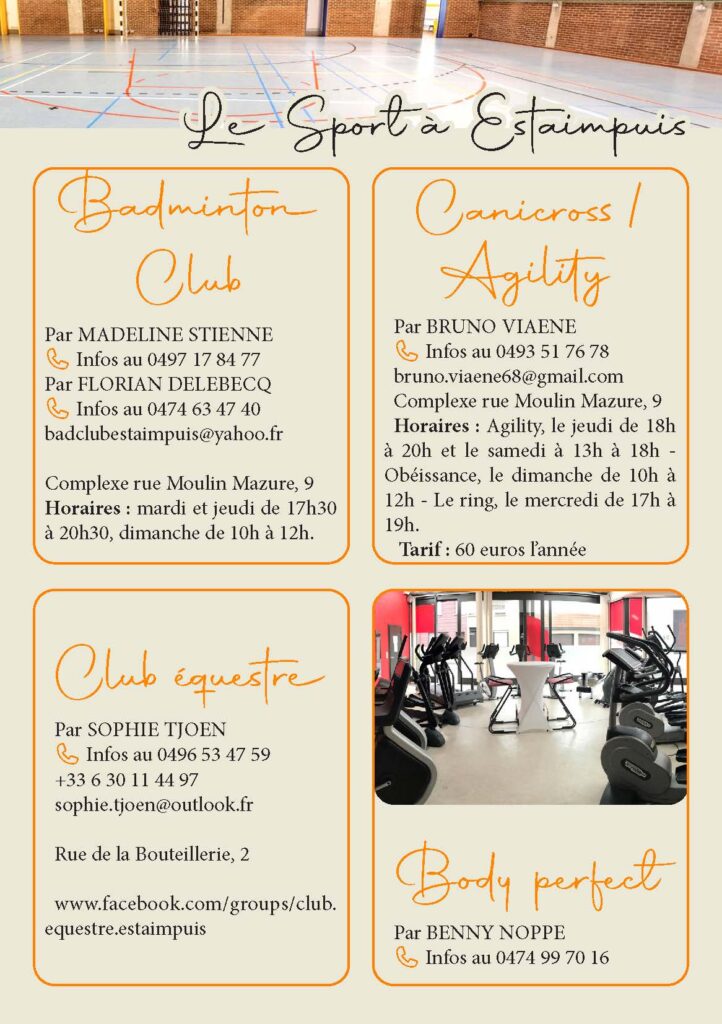 La commune d’Estaimpuis est également très impliquée dans le domaine sportif. L’entité dénombre d’ailleurs pas moins de trois halls sportifs. Que vous soyez intéressés par le football, le basket, le tennis, la marche, le tennis de table, ou une autre discipline sportive, chacun y trouvera son goût.