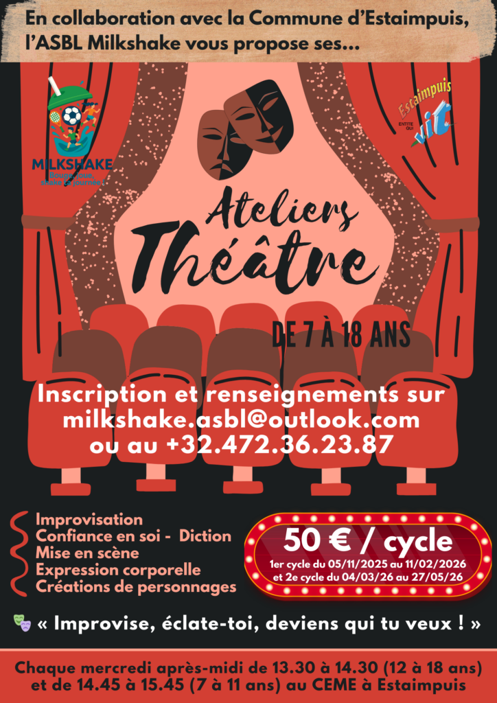 Vous avez envie de vous exprimer, de prendre confiance en vous, de créer votre personnage et de découvrir la scène ? En collaboration avec la commune d’Estaimpuis, notre ASBL lance ses « Ateliers Théâtre » ouverts à tous les écoliers et étudiants ! ![]()