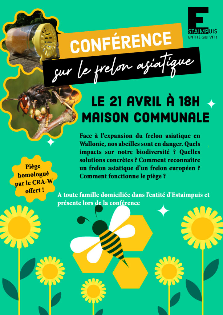 Notre service Environnement vous invite chaleureusement à une conférence sur le frelon asiatique le mardi 21 avril prochain au sein de la Maison communale.