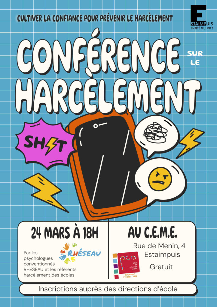 Nous vous proposons une conférence abordant le thème du harcèlement le mardi 24 mars prochain à 18h au sein du C.E.M.E. (rue de Menin -7730 Estaimpuis).