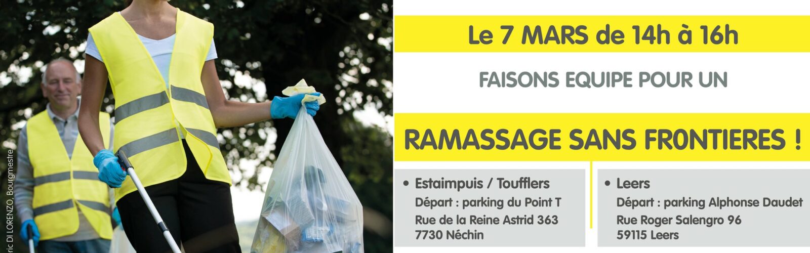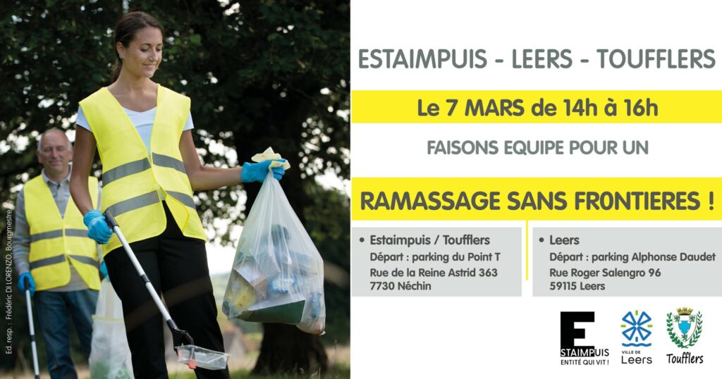 👍 Le samedi 7 mars, les communes transfrontalières d’Estaimpuis, de Leers et de Toufflers uniront leurs forces autour d’une marche de ramassage des déchets pour sensibiliser les citoyens à la propreté publique et initier les plus jeunes au respect de l’environnement