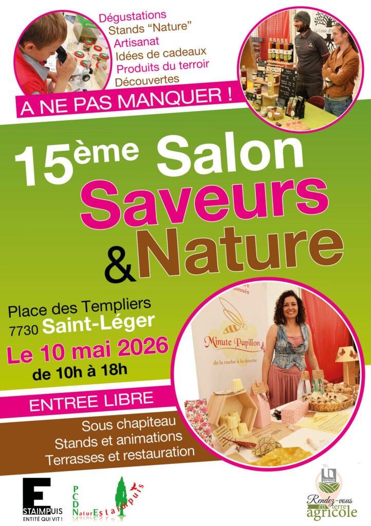 Evénement incontournable en Wallonie picarde et à Estaimpuis, la 15e édition du salon « Saveurs et Nature » vous ouvre ses portes le dimanche 10 mai, de 10h à 18h, à la place des Templiers – 7730 Saint-Léger.